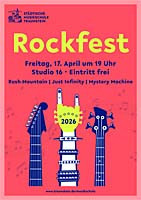 Drei Bands rocken am 17. April im Studio 16, wenn das Rockfest der städtischen Musikschule Traunstein in die VIII. Runde geht. Das Line-up: Mystery Machine - Just Infinity - Rush Mountain